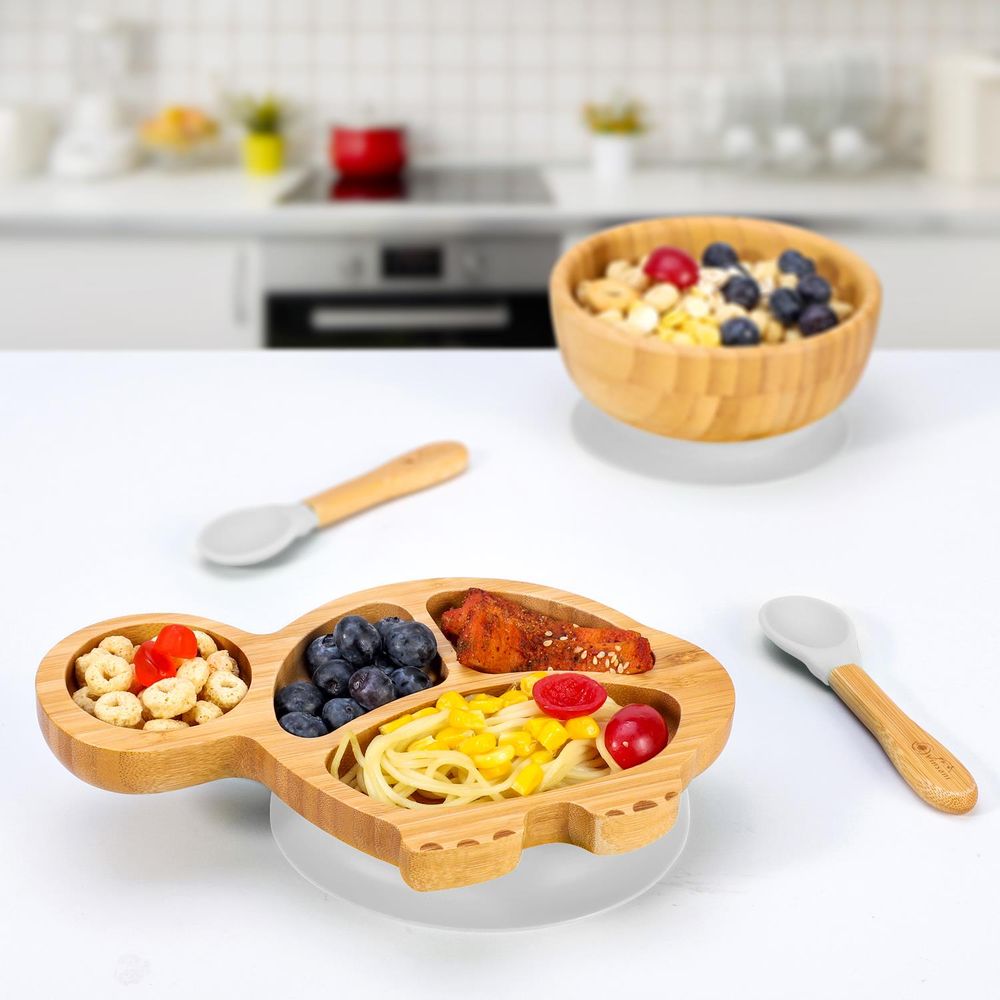 4-SECTIONED PLATE: Comes with a set of a plate, bowl, and 2 spoons. The 4 sectioned plate is convenient for serving various food groups and encouraging weaning. They are fantastic for assisting parents in preparing balanced meals.