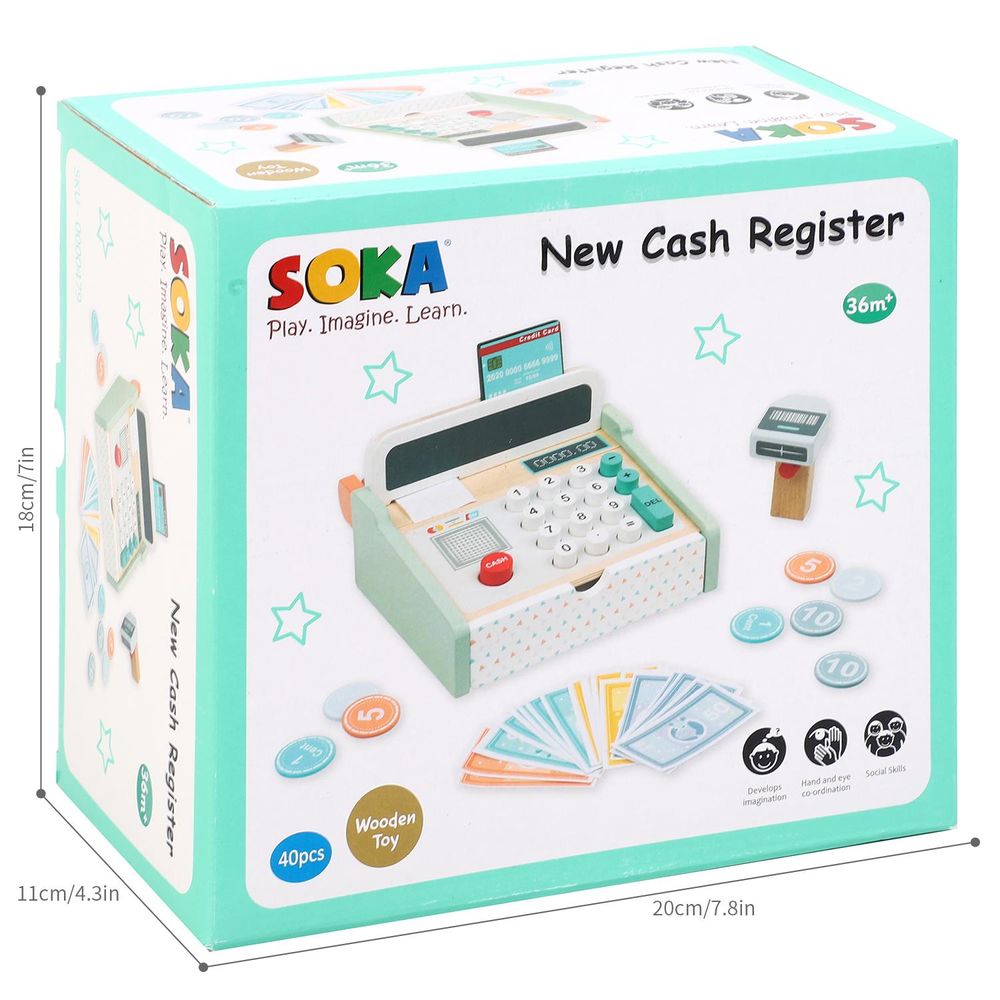 SET INCLUDES: One change drawer, one till roll, pretend notes (5’s, 20’s, 50’s, 100’s), pretend coins, one card scanner (can be pressed) and one credit card are included in our SOKA Wooden New Cash Register. This product measures 10 x 16 x 18.7 cm approx.