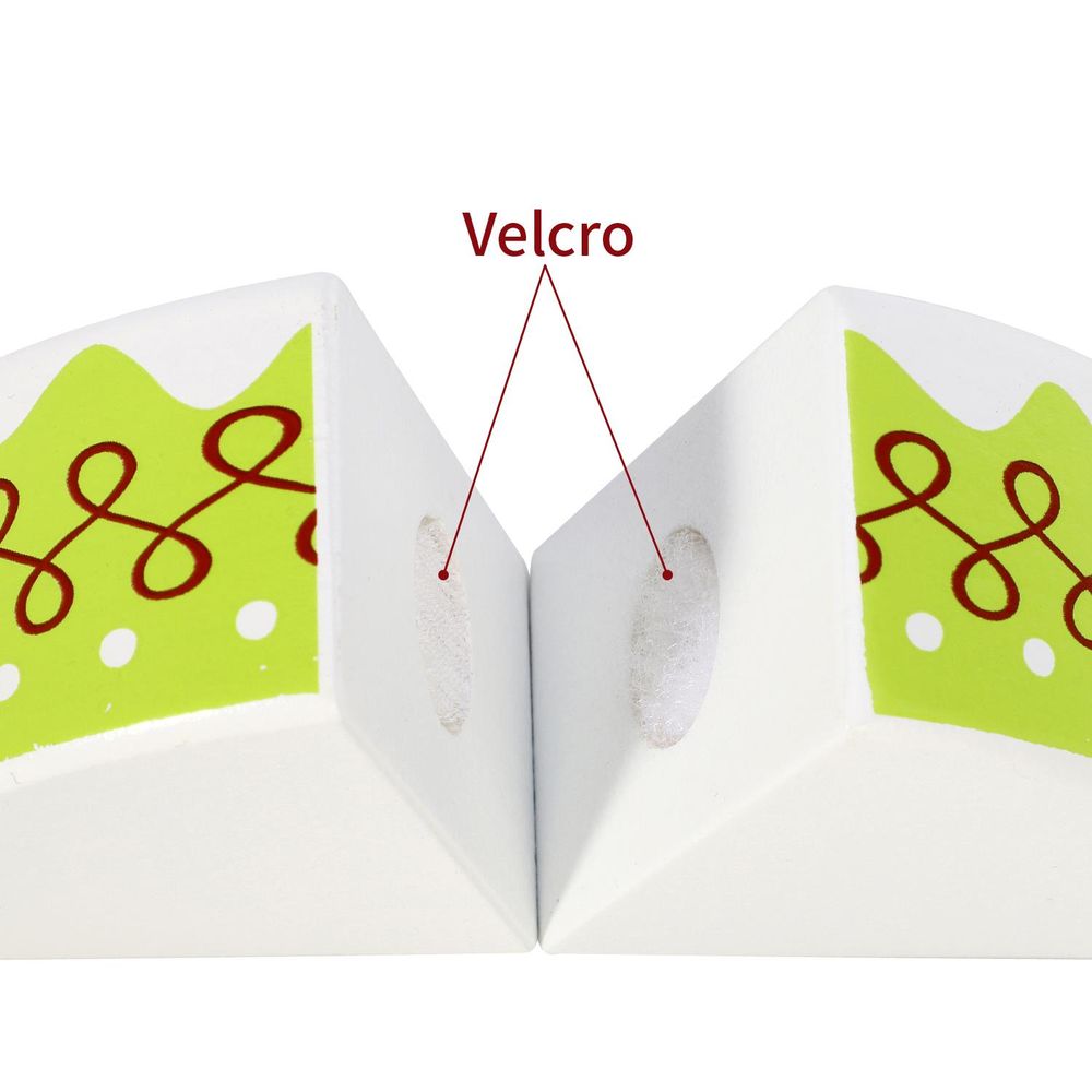 SET INCLUDES -  The wooden cream cake features 5 delicious cake slcies, 5 removable candles, a chocolate decoration with the words "Happy Birthday", a cake slicer and plate.