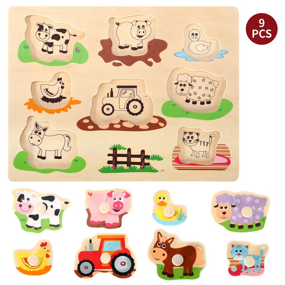 SET INCLUDES: Peg puzzle includes 1 Cow, 1 Pig, 1 Duck, 1 Chicken, 1 Sheep, 1 Horse, a cat, and a Tractor. Product Dimension: 30cm X 25.8cm