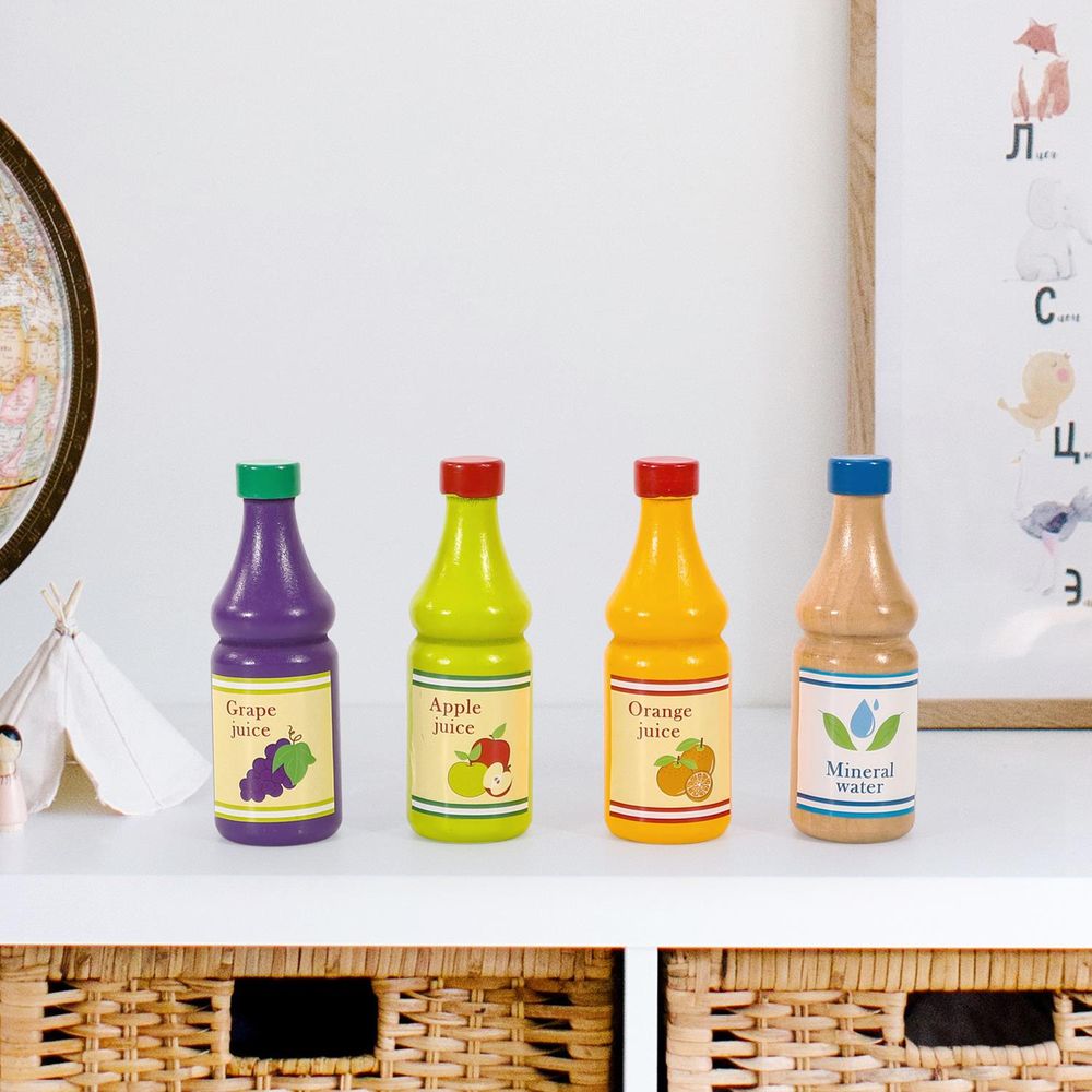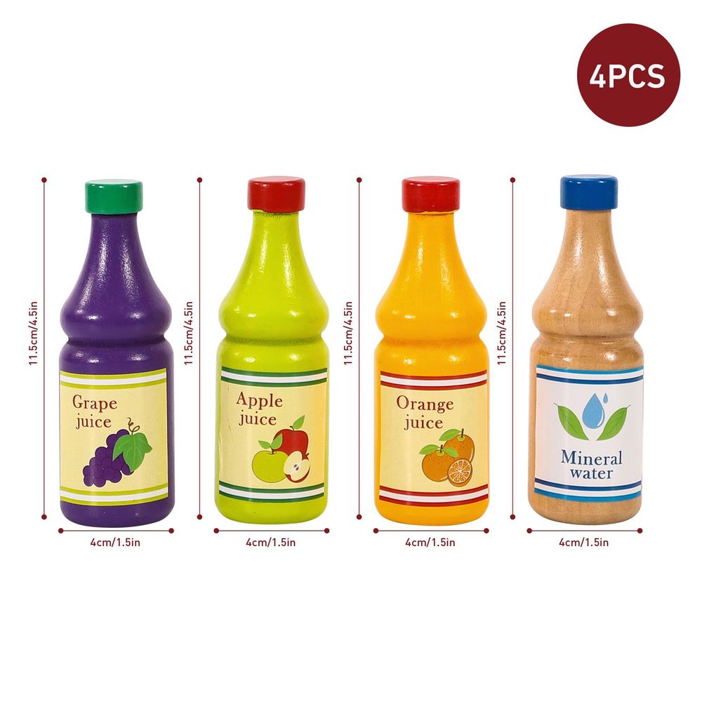 KITCHEN PLAYSET: SOKA pretend play beverage set 4 different wooden drink bottles - Mineral Water, Orange Juice, Apple Juice, Grape Juice. Please note that these are wooden bottles and do not contain any liquid.